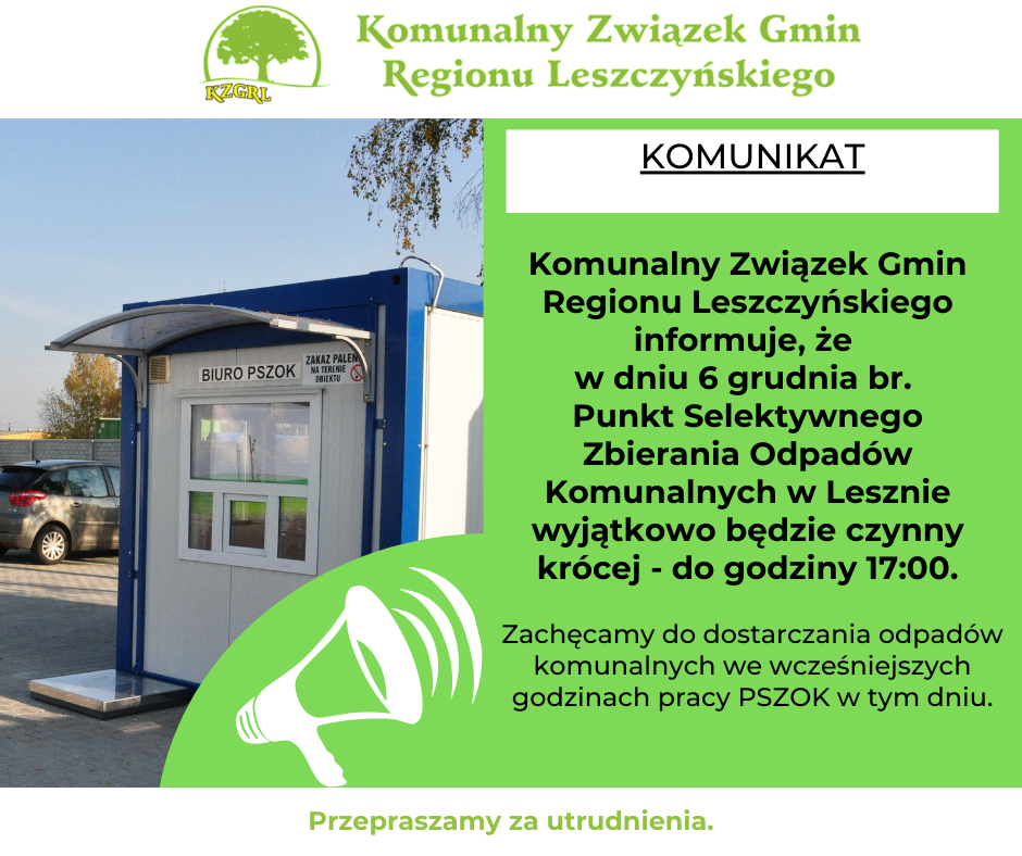 Informujemy, że w dniu 6 grudnia Punkt Selektywnego Zbierania Odpadów Komunalnych (PSZOK) będzie czynny wyjątkowo krócej – do godziny 17:00.