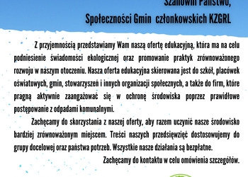 Z przyjemnością przedstawiamy naszą ofertę edukacyjną, która ma na celu podniesienie świadomości ekologicznej oraz promowanie praktyk zrównoważonego rozwoju w naszym otoczeniu. Nasza oferta edukacyjna skierowana jest do szkół, placówek oświatowych, gmin, stowarzyszeń i innych organizacji społecznych, a także do firm z terenu działania Komunalnego Związku Gmin Regionu Leszczyńskiego, które pragną aktywnie zaangażować się w ochronę środowiska poprzez prawidłowe postępowanie z odpadami komunalnymi. Nasze działania edukacyjne skupiają się także na promowaniu ograniczania odpadów.