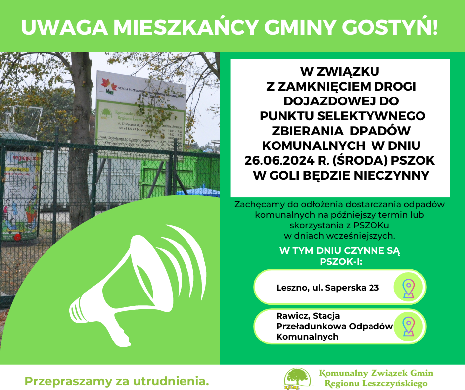 W dniu 26 czerwca w środę br. nieczynny będzie Punkt Selektywnego Zbierania Odpadów Komunalnych w Goli w Gminie Gostyń.