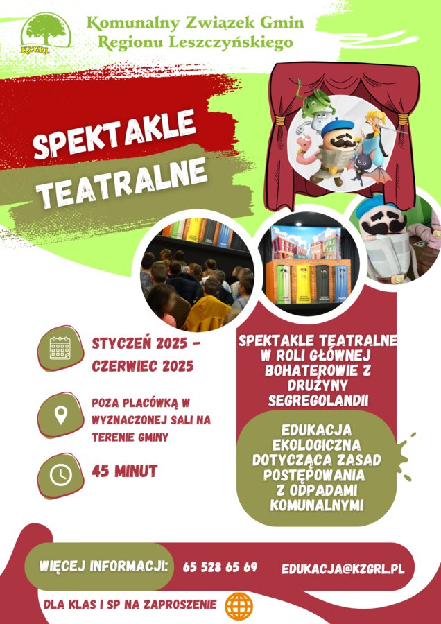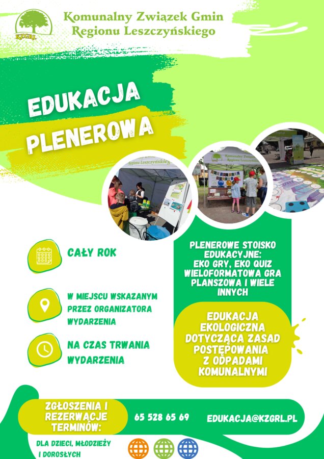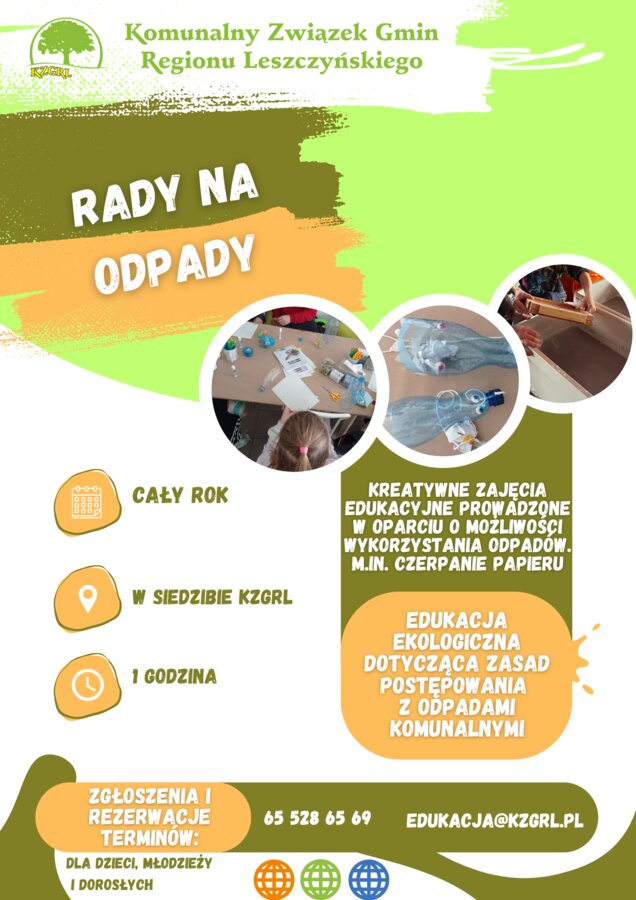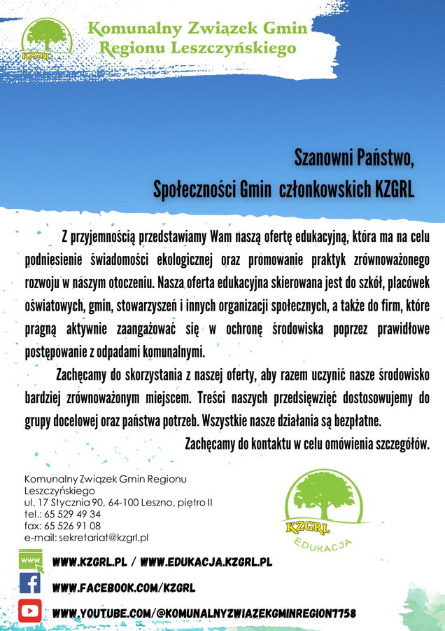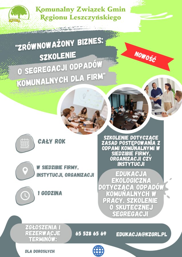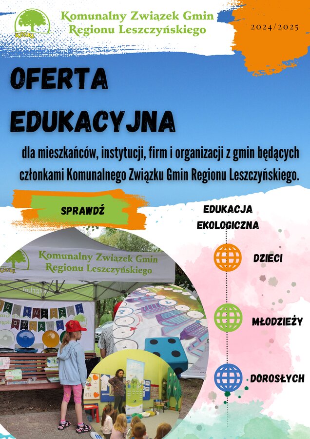 Z przyjemnością przedstawiamy naszą ofertę edukacyjną, która ma na celu podniesienie świadomości ekologicznej oraz promowanie praktyk zrównoważonego rozwoju w naszym otoczeniu. Nasza oferta edukacyjna skierowana jest do szkół, placówek oświatowych, gmin, stowarzyszeń i innych organizacji społecznych, a także do firm z terenu działania Komunalnego Związku Gmin Regionu Leszczyńskiego, które pragną aktywnie zaangażować się w ochronę środowiska poprzez prawidłowe postępowanie z odpadami komunalnymi. Nasze działania edukacyjne skupiają się także na promowaniu ograniczania odpadów.